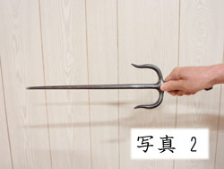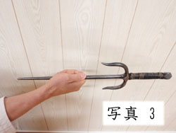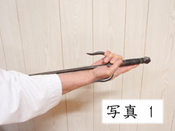 釵は元々が隠し武器だから、相手に分からないように逆手持ち(写真1)に持っているのが基本だが、十手を構えるように順手持ち(写真2)でいれば、物打ちを握られる可能性がある。(写真3)