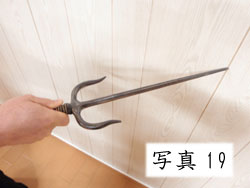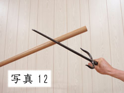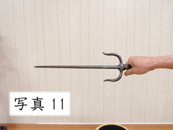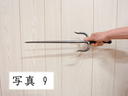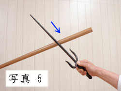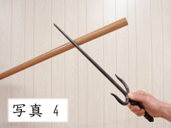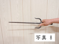 『図説・武器術』小佐野淳著 株式会社新紀元社 2007年発行によれば、写真11の持ち方ではなくて写真14のように翼(鉤)を上下に向けて構えるのが正しいとある。