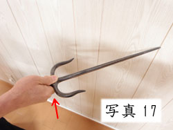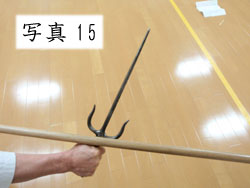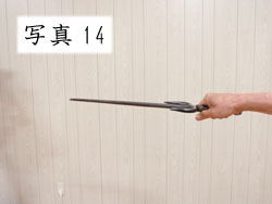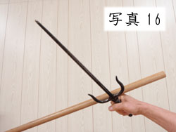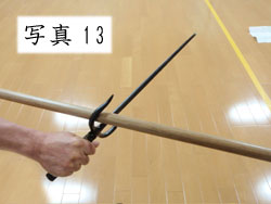 ここで、写真14のように持つと、写真15・写真16のように、相手の武器に当てられるという危険性がある。