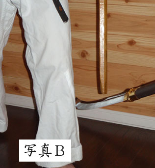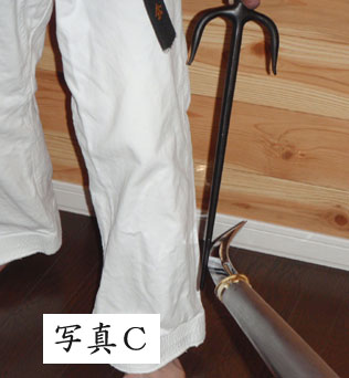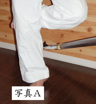 「演武型」にある「片足一本立払い受け」にて足を上げても、もう片方の足の脛に[薙刀]が当たる。(写真A)